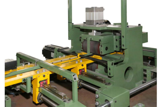 送料是本機(jī)的核心部分,它負(fù)責(zé)送料和測(cè)長,保證各種片型的長度精度,送料機(jī)主要核心部件有送料輥、測(cè)量輥、 導(dǎo)向定位導(dǎo)軌、伺服電機(jī)、編碼器、壓輥氣缸等組成。開卷機(jī)卷料料頭放出后,由送料機(jī)將卷料料頭送至沖剪床固定導(dǎo)軌。